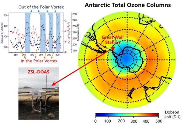 课题组使用具有自主知识产权的光谱技术准确测量了中国南极长城站上空的臭氧柱总量变化。由于该站点处在极地涡旋边缘,观测结果对臭氧损耗的研究有重要意义。极地涡旋是围绕两极的高层气旋性空气环流,它被极地急流和与之相关的冷空气限制在极地地区。极地涡旋内部的极低气温(<195K)导致了极地平流层云的形成,进而极地平流层云为导致臭氧损耗的非均相反应提供了反应界面,最终导致了南极臭氧的快速波动。