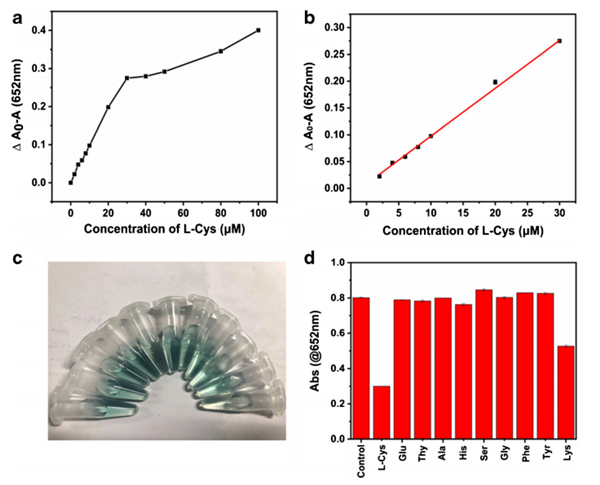 图2. a-b: L-半胱氨酸的测定;c-d:半胱氨酸的特异性检测