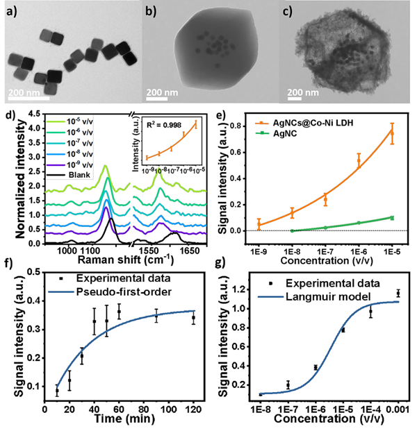 图2.(a-c) AgNC、AgNCs@ZIF-67和AgNCs@Co-Ni LDH的TEM图。(d-e)AgNCs@Co-Ni LDH的苯甲醛SERS光谱及与AgNC对比的信号浓度响应图。(f-g)苯甲醛在Co-Ni LDH上的吸附动力学和热力学实验数据及拟合曲线(拟一级动力学模型和Langmuir模型)