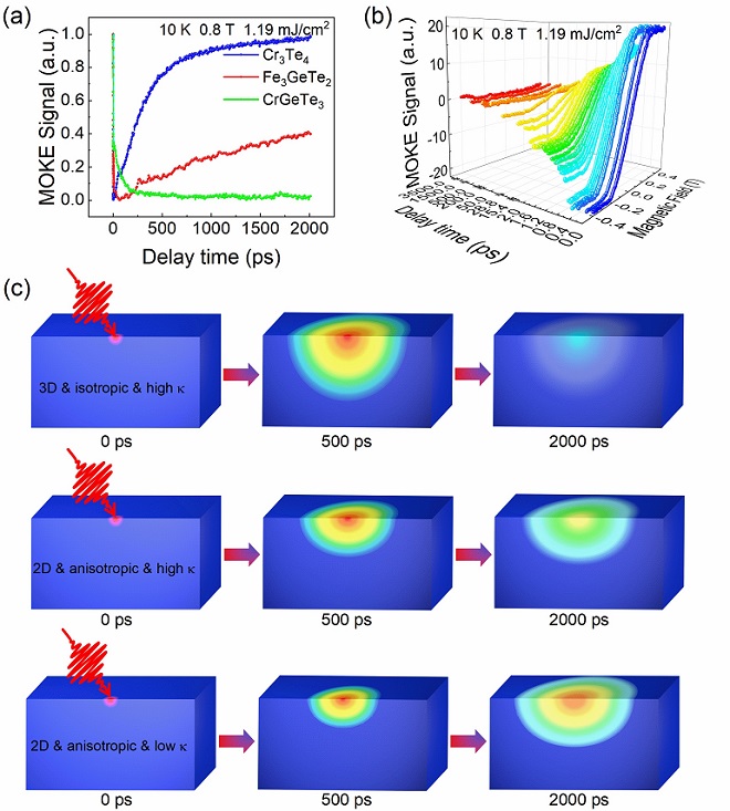 (a):三个样品的TR-MOKE信号。(b):Cr2Ge2Te6在不同时间延迟下的磁光克尔磁滞曲线。(c):三种模型在激光激发后的自旋弛豫示意图(其中,κ表示热导率,红色区域表示自旋无序,蓝色区域表示自旋有序)。