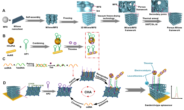 针对此类问题,课题组开发出高灵敏度的适配体传感器,利用具有优异电子传输通道的Ti3C2Tx MXene多级孔结构框架作为传感材料,同时选择具有高的电催化效应的金属纳米探针作为信号放大器,构建出应用于血液中凝血酶精准检测的高灵敏度适配体传感器。该传感器可以检测皮摩尔浓度的凝血酶,同时也展现出优异的抗干扰性和稳定性。