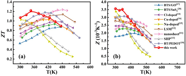 此外,研究人员通过复合体系设计与性能调控,向BTS基体复合介观尺度导电聚合物聚苯胺(PANI)纳米粒子,构建介观尺度的载流子输运调控和声子散射(阻隔)基元,研究和探讨超低热导率导电聚合物基元对BTS基复合体系晶格热导率、热电势及PF等的影响。研究发现,复合体系的晶格热导率在300 K时降低了49%,这主要是由于聚合物包裹体增强了声子散射。此外,无机/有机边界处形成的界面势产生了能量过滤效应,导致复合体系的热功率提高8%。1.5wt%BTS基复合样品的最大ZTmax 达到1.22 (345 K) (Chem . Eng. J, 455, 140923(2023))。