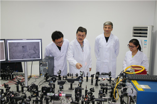 图1. 亚历山大?冈察洛夫(左二)和尤金?格列戈良茨(右二)正与量子中心青年研究人员一起讨论高压实验数据。