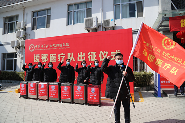 援鄂医疗队队长孙爱民带领队员们宣誓:“我自愿加入中国科学院合肥肿瘤医院援鄂医疗队,不忘从医初心,坚决服从大局,担当使命,驰援武汉。坚决打赢疫情狙击战!”