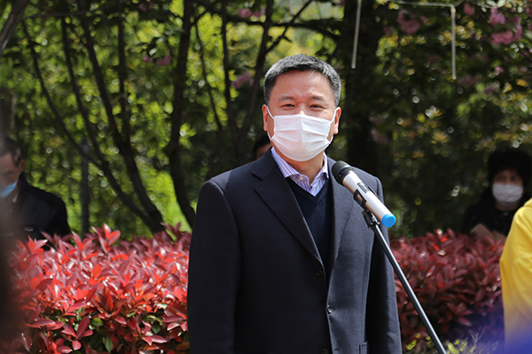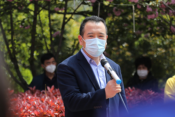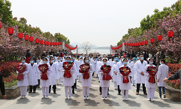 王宏志致欢迎词,他说,队员们在疫区中的疫区——武汉市中心医院后湖院区奋战30余个日日夜夜,帮助43位患者成功治愈出院,无一例死亡、无一例复阳,队员无一例感染,得到了各方的充分肯定,医院因他们而骄傲。