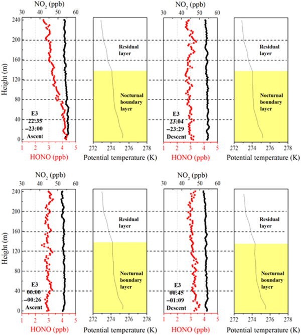 HONO作为OH自由基的重要前体物,其光解贡献了日间25%–60%的OH自由基,在大气光化学反应过程中扮演着重要作用。尽管对大气HONO的研究已有几十年的历史,其详细的形成机理仍存在争议,夜间地表面和气溶胶表面的HONO生成仍是研究的热点之一。因此,针对北京市高雾霾污染状况,开展夜间HONO垂直梯度研究,研究不同污染阶段夜间地表面和气溶胶表面的HONO生成,对了解夜间大气HONO生成机制具有重要意义。
