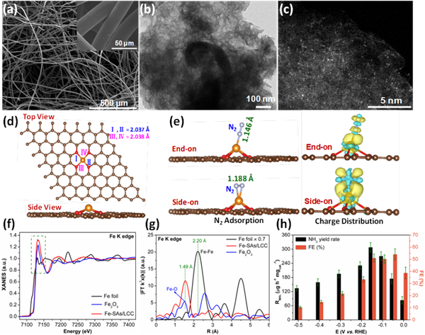图. (a) 木质纤维素的SEM图;Fe-SAs/LCC的 (b) TEM图和 (c) 球差校正的HADDF-STEM图;(d) 石墨碳上优化的Fe-(O-C2)4结构;(e) Fe-(O-C2)4以end-on和side-on两种方式吸附氮气的结构,Fe-(O-C2)4以end-on和side-on两种方式吸附氮气的差分电荷密度图(黄色和青色分别代表得到和失去电子;褐色球、红色球和黄色球分别代表C、O和Fe原子);Fe-SAs/LCC、Fe2O3和Fe foil样品的 (f) Fe K边XANES光谱和 (g) Fe K边的R空间EXAFS;(h) Fe-SAs/LCC负载于玻碳电极上在各个反应电位对应的产氨速率和法拉第效率。