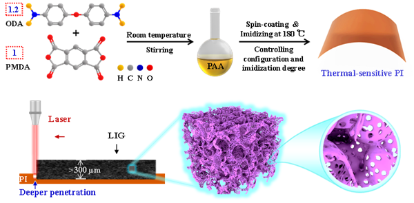 图1. 聚酰亚胺的热敏性调控及宏观厚度石墨烯晶体膜的激光诱导生长。