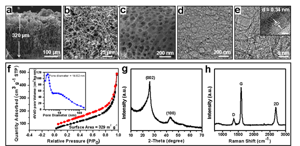 图2. 宏观厚度石墨烯晶体膜的结构表征。