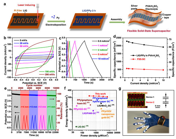 为此,科研人员采用过快速高效、过程简单、环境友好、可同步图案化的高能激光诱导法,在聚酰亚胺基底上进行三维多孔石墨烯晶体膜的原位制备。为了调控激光与聚酰亚胺前驱体的相互作用,科研人员通过控制原料化学计量比和酰亚胺化反应温度来调控产物聚酰亚胺的酰亚胺化程度和分子构型,从而改变其热敏感性。最终,在聚酰亚胺膜上原位生长出厚度高达320 μm的分级多孔结构石墨烯晶体膜,其面积和体积比电容高达172.2 mF/cm2 和4.13 mF/cm3,展现出巨大应用潜能。进一步原位电沉积赝电容材料聚吡咯,可以制得石墨烯/聚吡咯复合电极,其面积比电容高达2412.2 mF/cm2。研究发现,以该复合电极材料作为电极制造的平面叉指形柔性全固微型态超级电容器,可获得高达134.4 μWh/cm2和325.2 μW/cm2的能量密度和功率密度,且同时兼具优异的倍率性能、循环稳定性和机械柔韧性。