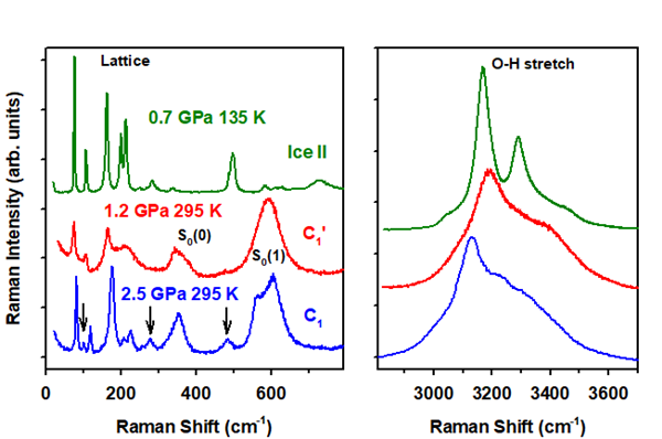 拉曼光谱和理论计算揭示了本研究揭示的新相C1'中的氢无序性质,其不同于众所周知的有序相C1,这种新结构在压力升高或温度降低后会转变为C1相。它也可以被看作是有序冰的无序结构,与其他所有已发现的有序冰结构(如ice I 与ice XI,ice VII与ice VIII)均不同,是一种新型无序冰结构。