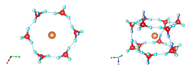 图2. 水合物C1'在R-3c对称性下的结构,其中主要结构模型(H2O环)以不同的投影显示,显示出两种不同的无序模式,“环状”无序(在由六个氧原子构成的类似扶手椅的虚拟平面)和“无环”(平面外)无序。