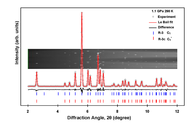 图3. C1'相的粉末衍射数据。红色短刻度对应于R-3c空间群,蓝色短线对应R-3(与iceⅡ相同)结构的空间群。