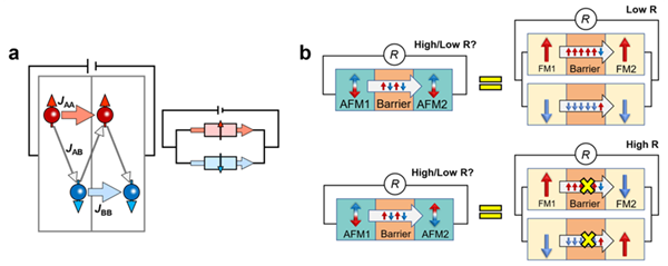 反铁磁材料具有零净磁矩、零杂散磁场、超快磁动力学响应等优点,有望取代铁磁材料,成为高密度、低功耗、高稳定性、超快读写的下一代自旋电子学器件。然而,由于反铁磁序参量(奈尔矢量, Néel vector)很难通过常规方法进行调控和探测,制约了反铁磁自旋电子学器件的信息读写。通过隧道磁阻和自旋转移力矩进行电学读写的反铁磁隧道结,是反铁磁自旋电子学理想的器件方案,但由于反铁磁材料只有自旋简并的电子态密度,通常只能支持自旋中性的电流,很难通过传统机制实现用于信息读写的隧道磁阻(Tunneling Magnetoresistance, TMR)效应和自旋转移力矩(Spin-Transfer Torque, STT)效应。