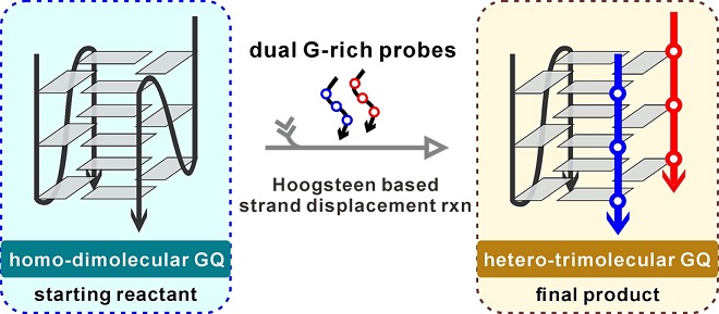 图1:双份富G短链探针与自二聚G四链体起始物通过新型Hoogsteen链置换反应重新组装成异三聚G四链体