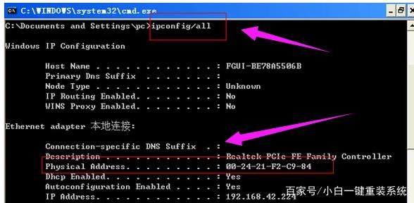 3、在命令提示符中输入“ipconfig/all”,便可以看到自己电脑的mac地址了。