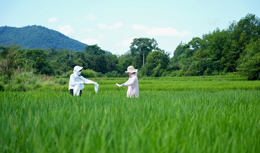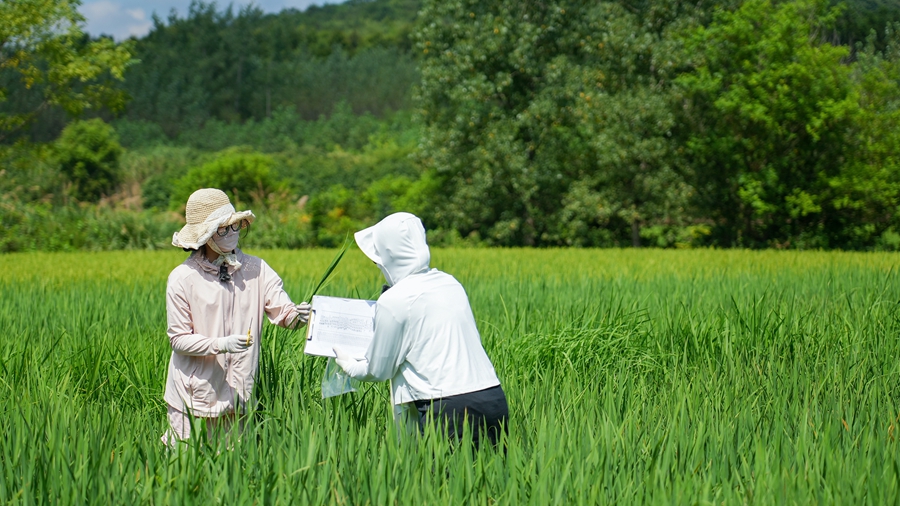 记者站在稻田边站立仅仅一会儿,黑色的裤子就被阳光晒到烫腿。就这样,两位女科研工作者顶着烈日在水稻田里缓慢挪动,寻找着目标样本。
