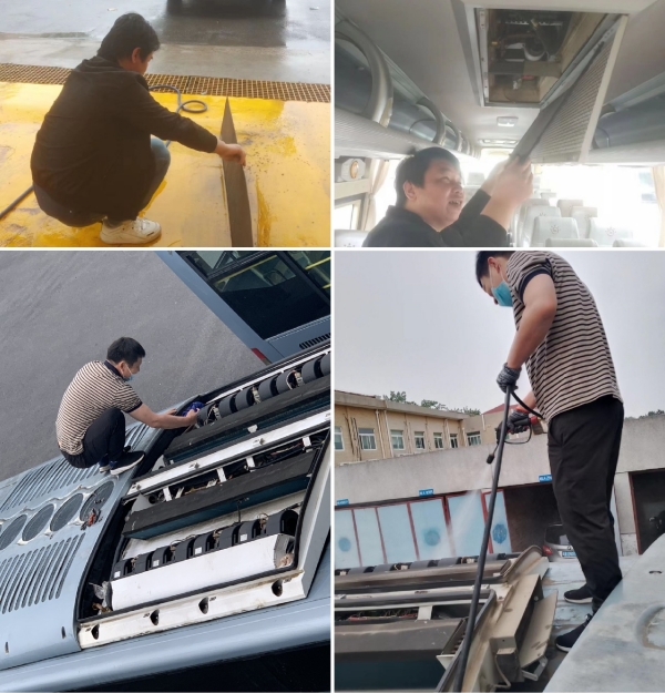 此次工作分为两部分,一是组织车辆驾驶员对车辆内部卫生进行全面检查,并使用专门消毒剂和清洁剂进行卫生清洁;二是安排专业人员对班车空调系统保养,清洗干净空调滤网,包括对过滤器、蒸发器盘管和通风口进行消毒,防止滋生细菌。