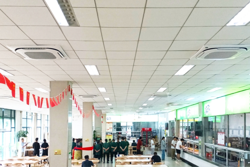 此次改造主要集中在三个环节。首先,三号食堂柜机空调已全部升级为中央空调系统,并同步完成了电力增容,确保了食堂的舒适度和用电安全。一号食堂把老旧小功率空调更换为新款大功率空调,大幅提升了单位面积制冷能力。其次,两所食堂的桌椅全部更新为实木餐桌椅,淘汰了一批陈旧、磨损的桌椅,完善了食堂的硬件设施水平。最后,食堂的内部结构也进行了优化调整,不仅提高了空气流通性,还通过合理的布局和照明设计,使整体环境更加明亮、宽敞和舒适。