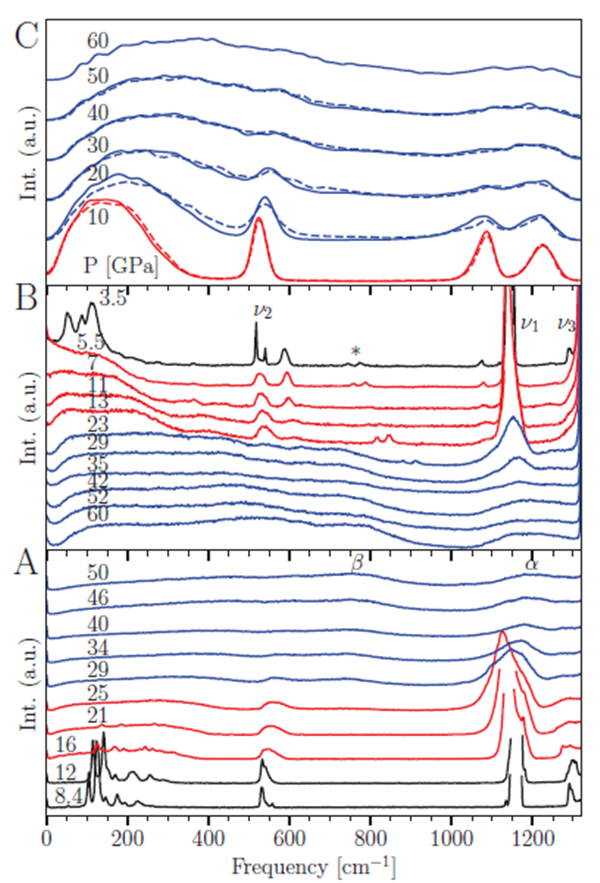 图1. 不同压力下的SO2的拉曼光谱:(a) 实验上测量的77 K下的加压过程中的拉曼光谱(b) 实验上测量的室温下卸压过程中的拉曼光谱(c) 分子动力学模拟获得的振动态密度谱。黑线-分子晶体相,红线-分子非晶相,蓝线-聚合物非晶相。