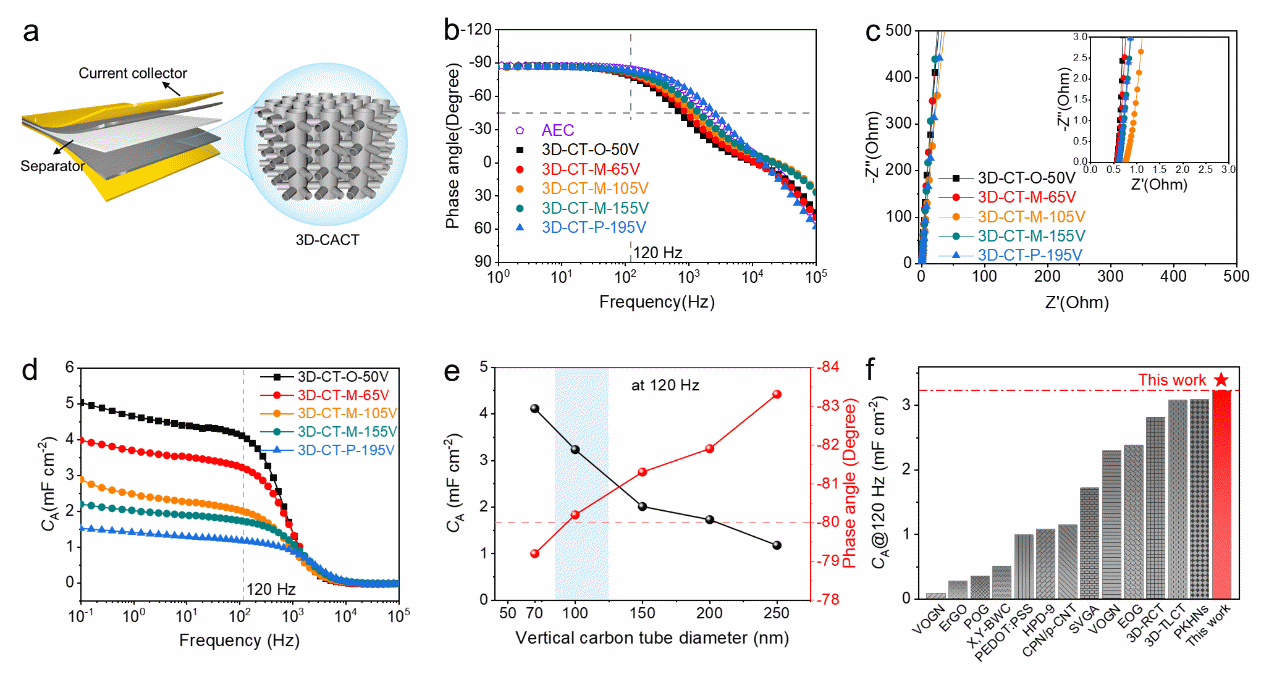 科研人员进一步以3D-CACT为电极,组装双电层电容器。测试发现器件在120 Hz下具有-80.2°的相位角、小于0.07 Ω cm2的等效串联电阻以及0.25毫秒的较短电阻-电容(RC)时间常数,表现出快速频率响应性能。该器件在120 Hz下的面积比电容达到3.23 mF cm-2,远高于商用铝电解电容器(约0.08 mF cm-2),并且高于迄今报道的三明治构型的水系滤波超级电容器的面比电容。上述结果表明,3D-CACT纳米阵列电极能够同时提供高速离子传输通道和丰富电荷吸附位点,具有优异的滤波性能。