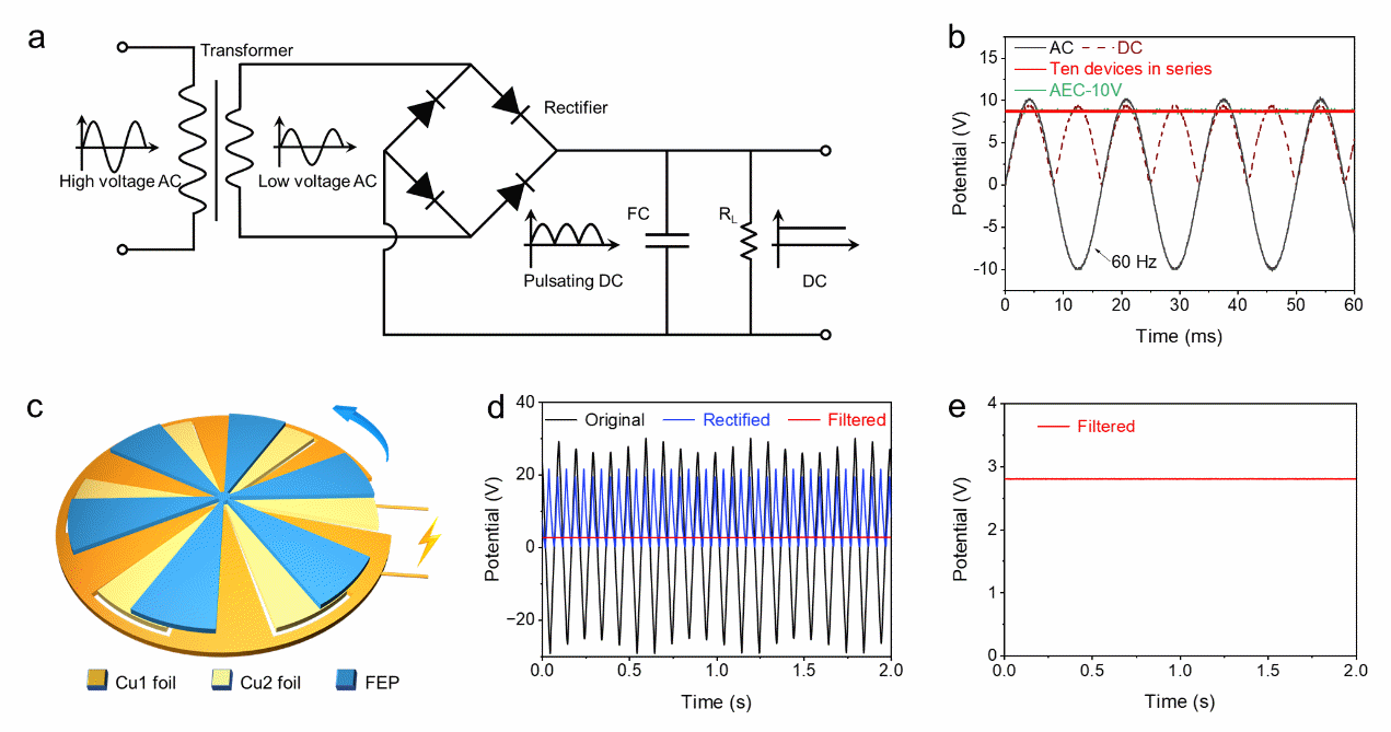 滤波电容器在实际应用中,常常需要满足高额定电压的要求。因此,科研人员对标6.3 V和10 V的商用铝电解电容器,分别将六组和十组相同的基于3D-CACT电极的器件进行串联,以扩展电容器的工作电压。测试发现,器件串联后仍保持较好的频率响应性能,并具有较短的弛豫时间和较低的损耗。该结果表明所制备的电容器具有高稳定性和均匀性,在串联时能够保持稳定的性能,具有实际应用潜力。随后,科研人员以十组串联器件为滤波器,进行交流滤波应用演示,以验证器件的滤波性能。研究发现,器件能够将正弦型的市电和其它各种不同类型的输入交流信号(如方波、三角波和噪声波等)滤波为平滑的直流信号,滤波效果可与商业AEC相媲美。此外,科研人员自制了旋转式摩擦纳米发电机来模拟环境中的不连续脉冲交流输出,验证了滤波电容器组对该信号同样具有出色的脉冲平滑能力。