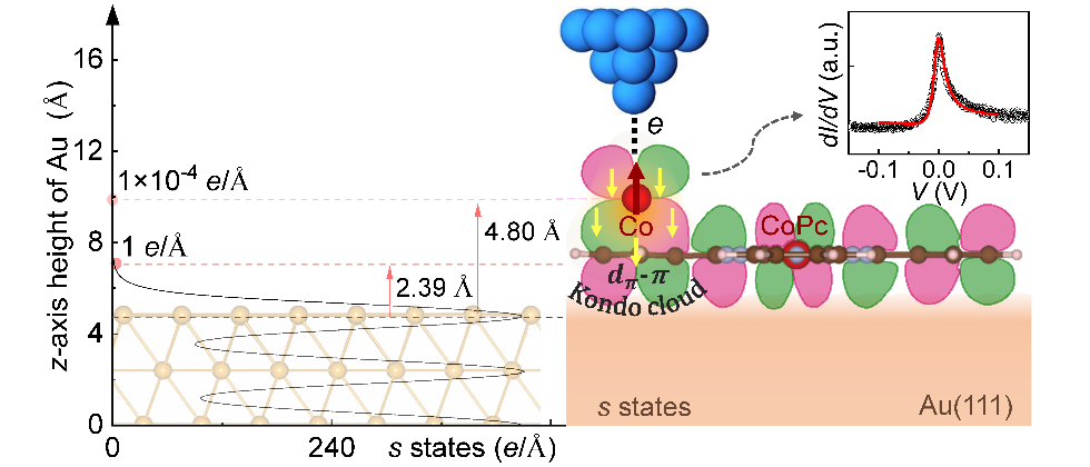针对上述问题,研究人员在前期工作中,从分子工程角度出发,利用d-π强相互作用机制,在一系列零维和二维体系中取得进展。例如,在Au(111)表面上构建的Co-CoPc分子复合物,由于Co原子d轨道和CoPc分子的大π轨道之间形成的强相互作用,有效规整了Co原子的自旋态,使形成的近藤单态不受外界环境的影响。尽管如此,当时普遍认为体系中产生的近藤效应与传统机制相同,即由Au(111)衬底的巡游电子来屏蔽Co原子的自旋产生的。这种现象意味着CoPc分子的作用可能被低估,促使研究人员深入探究近藤效应的形成机理。