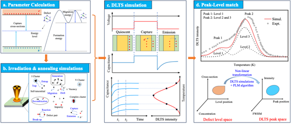 图1. 第一性原理驱动的辐照半导体深能级缺陷多维度鉴定的多尺度模型框架
