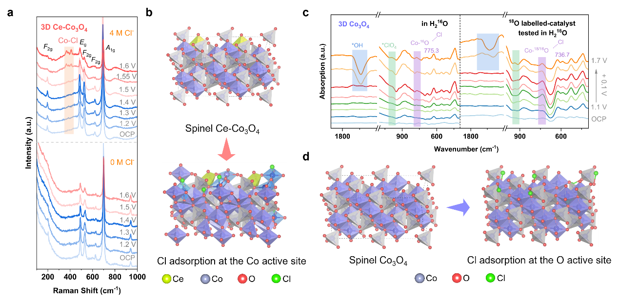 针对海水电解耦合二氧化碳捕集技术对高性能、低成本阳极CER催化剂的迫切需求,团队开展了系统的材料开发与基础研究。研究团队在具有三维有序大孔结构的尖晶石Co3O4中引入原子级分散的铈(Ce),构筑了CER催化剂3D Ce-Co3O4。催化剂结构表征显示,Ce原子通过占据八面体Co位点诱导多面体产生畸变,形成了能直接吸附Cl⁻的不饱和Co活性中心。原位表征和DFT计算进一步证实,Ce掺杂诱导活性位点由氧中心转向Co中心,优化了Cl⁻吸附能,在提升活性的同时显著抑制了晶格氧腐蚀。在酸性NaCl溶液中,3D Ce-Co3O4达到10 mA cm–2电流密度的过电位仅为44 mV,CER选择性高达99.1%。在模拟氯碱电解槽工况条件下,3D Ce-Co3O4在2.5 kA m-2工业级电流密度下可连续稳定运行超550 h。该活性位点诱导策略为设计高活性、高稳定性的非贵金属CER催化剂提供了重要参考。该研究工作以中国科学院合肥物质院为第一完成单位发表在Nature Communications(Nat. Commun., 2026,DOI:10.1038/s41467-026-70443-x)上。固体所资源创新中心尹华杰研究员、合肥国家实验室李向阳研究员为共同通讯作者。