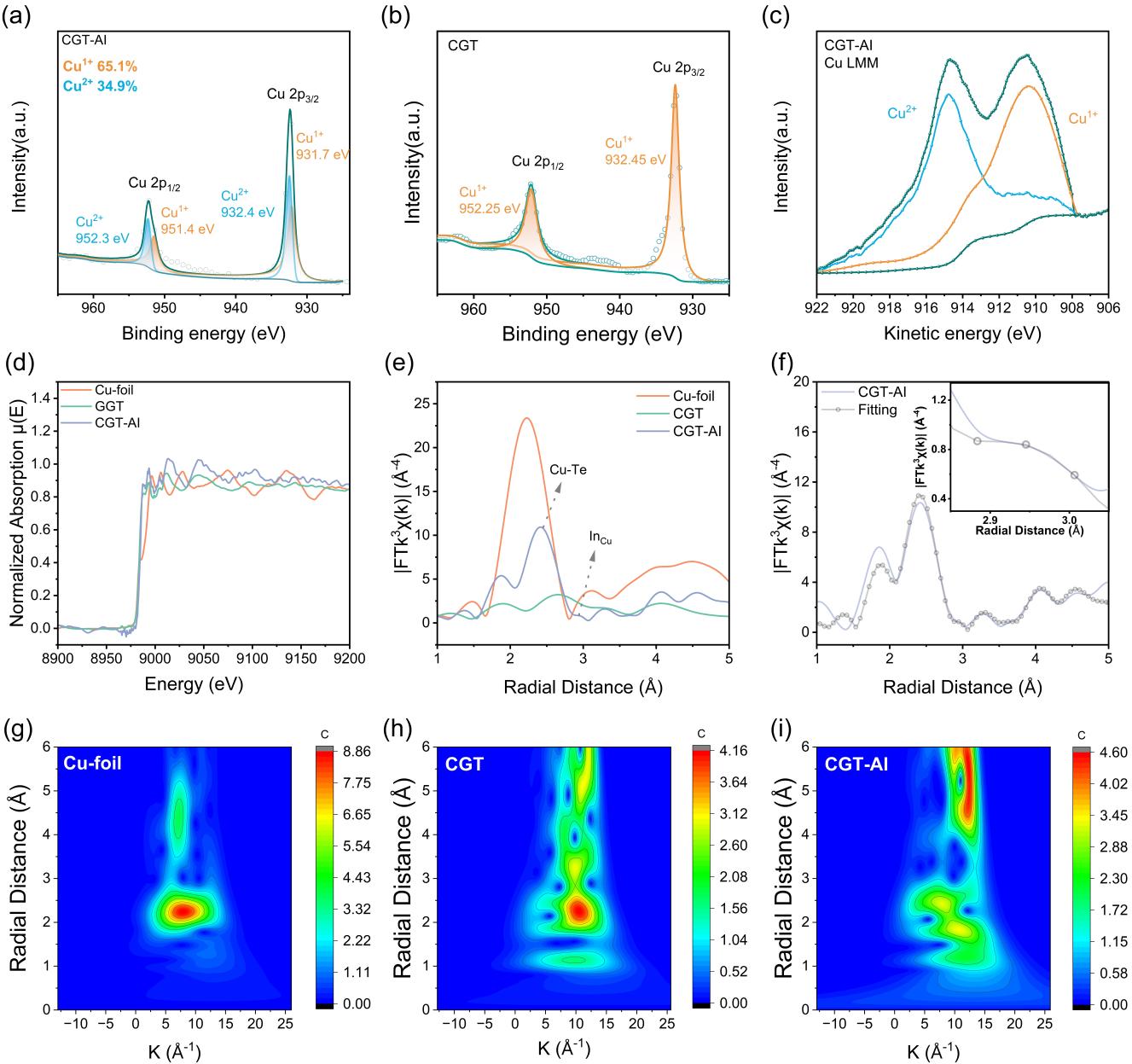 图2. (a)Cu0.7Ag0.3Ga0.6In0.4Te2(CGT-AI)的Cu2p XPS 光谱;(b)CuGaTe2(CGT)的Cu2p XPS 光谱;(c)CGT-AI的Cu LMM 俄歇光谱;(d)归一化CuK边 EXAFS 光谱;(e)Cu箔、CGT和CGT-AI的傅里叶变换k3加权 EXAFS ;(f)CGT-AI的 EXAFS 拟合曲线;(g-i)Cu箔(g)、CGT(h)和CGT-AI(i)的k3加权 EXAFS 的小波变换