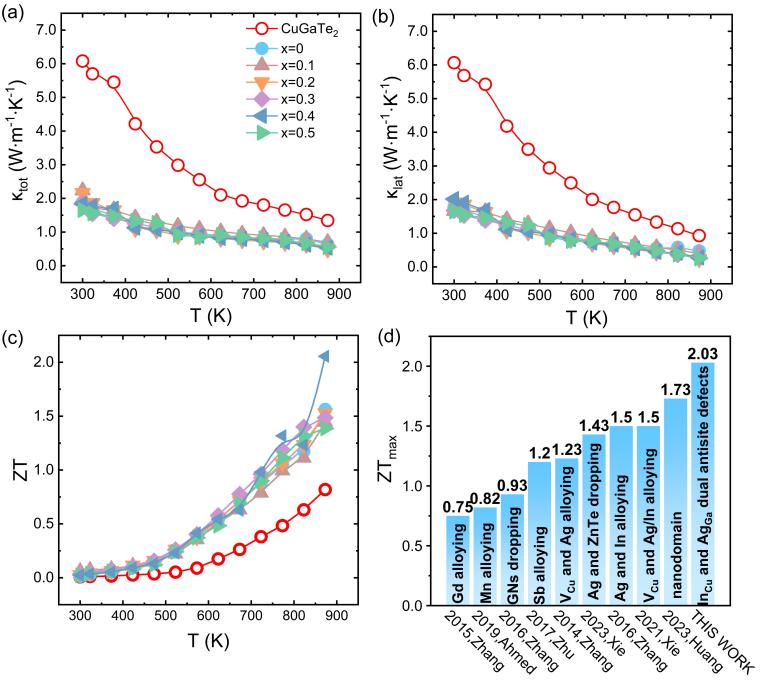 图3. (a-c)纯CuGaTe2和Cu0.7Ag0.3Ga1-xInxTe2(x=0-0.5)的性能对比:(a)总热导率(κtot),(b)晶格热导率(κL),(c)ZT值的温度依赖性;(d)本研究与已报道数据中ZTmax最大值的详细对比