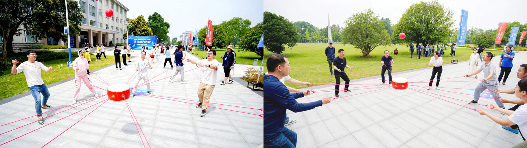 在随后的无敌风火轮项目中,各支参赛队伍成员需步调一致,推动风火轮履带前行,滚滚轮带如何以最快速度前行,考验的是团队成员之间的默契与协作能力。在鼓动人心环节,8名成员围绕大鼓,抓住绳子末端,通过动作和节奏控制鼓面颠球,对于队员的身体协调和根据球运动轨迹快速调整能力是极大考验,现场欢声笑语不断,气氛热烈。