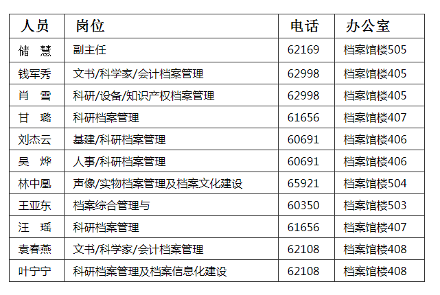 人员 岗位 电话 办公室 储 慧 副主任 62169 档案馆楼505 钱军秀 文书/科学家/会计档案管理 62998 档案馆楼405 肖 雪 科研/设备/知识产权档案管理 62998 档案馆楼405 甘 璐 科研档案管理 61656 档案馆楼407 刘杰云 基建/科研档案管理 60691 档案馆楼406 吴 烨 人事/科研档案管理 60691 档案馆楼406 林中凰 声像/实物档案管理及档案文化建设 65921 档案馆楼504 王亚东 档案综合管理与 60350 档案馆楼503 汪 瑶 科研档案管理 61656 档案馆楼407 袁春燕 文书/科学家/会计档案管理 62108 档案馆楼408 叶宁宁 科研档案管理及档案信息化建设 62108 档案馆楼408