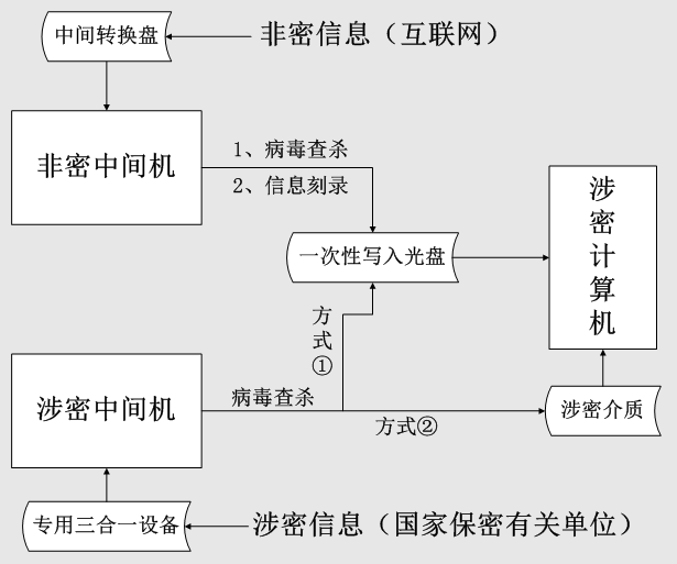 从国家保密有关单位取得涉密信息后,需要通过专用三合一设备导入到涉密中间机进行病毒查杀,确认无误后,将信息刻录到一次性写入光盘或导入涉密介质,再导入到涉密计算机内;