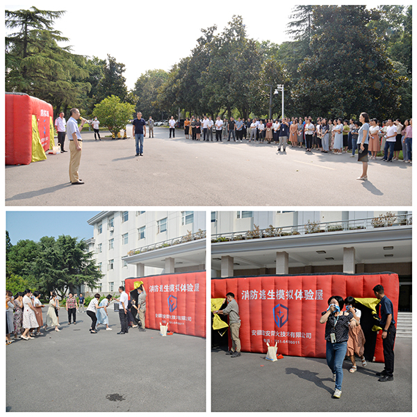 二号楼南广场提前放置了“消防逃生模拟体验屋”,屋内环境昏暗、通道曲折,配合烟雾弹和模拟火盆,模拟了火灾情景。员工们按照指引,依次依序进入逃生屋,体验在烟雾弥漫、光线昏暗的情况下,用湿毛巾捂住口鼻、低下身体按照安全出口指示牌“逃”出火灾现场。火灾疏散逃生体验屋的演练,让员工们感受了发生火情时身处浓烟中的慌乱情绪,学习了火场逃生技能。身临其境的演练让大家印象深刻,取得了良好的效果。