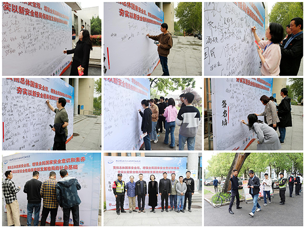为进一步激发职工学生的参与性,4月14日,安全保密处在3个职工食堂门口布置了“第八个全民国家安全日”主题签名墙,发放了安全保密处印制的《2023年国家安全教育日》三折页和《合肥物质院防诈骗教育宣传手册》等学习材料,号召职工学生要始终坚持总体国家安全观,用切身行动维护重点领域国家安全,邀请大家在签名墙上郑重地写下自己的名字,现场职工学生踊跃参与签名活动。