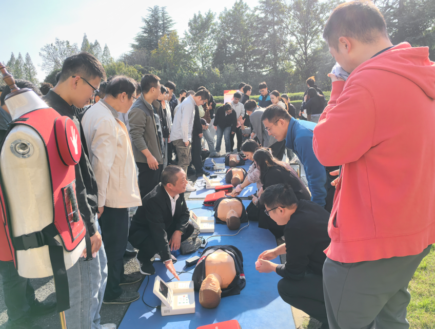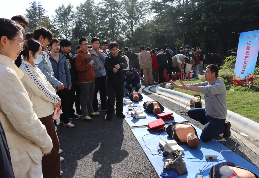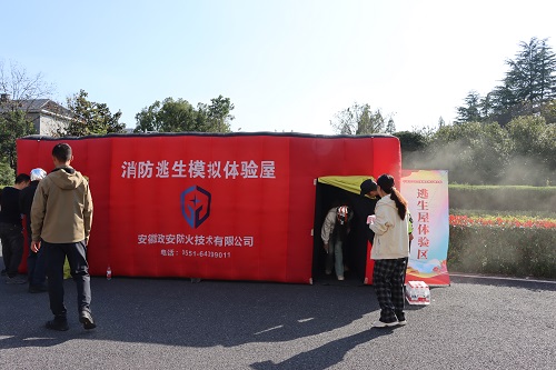 在一号楼南广场,特别设置了消防安全和应急救护实操专区,参与者用被水浸湿的毛巾捂住口鼻,依次进入“消防逃生模拟体验屋”,身临其境地感受火灾现场烟雾缭绕、视线不清的逃生环境。参与者通过对灭火器的操作、心肺复苏和海姆立克急救方法的实操学习,进一步增强了消防安全意识和应急救护能力。