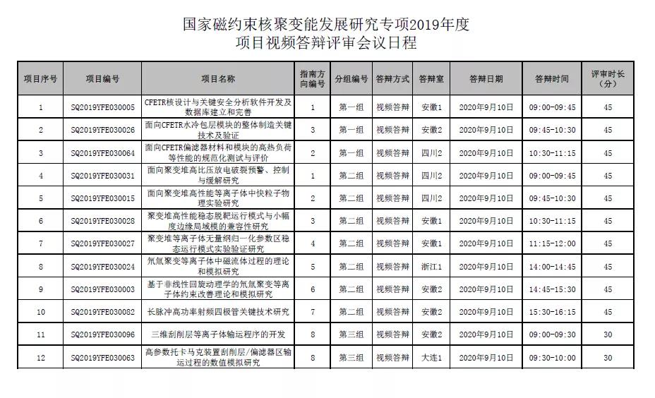 根据国家磁约束核聚变能发展研究专项2019年度项目评审工作安排,定于2019年9月10-11日召开项目视频答辩评审会。现将项目评审具体安排和有关事项通知如下: