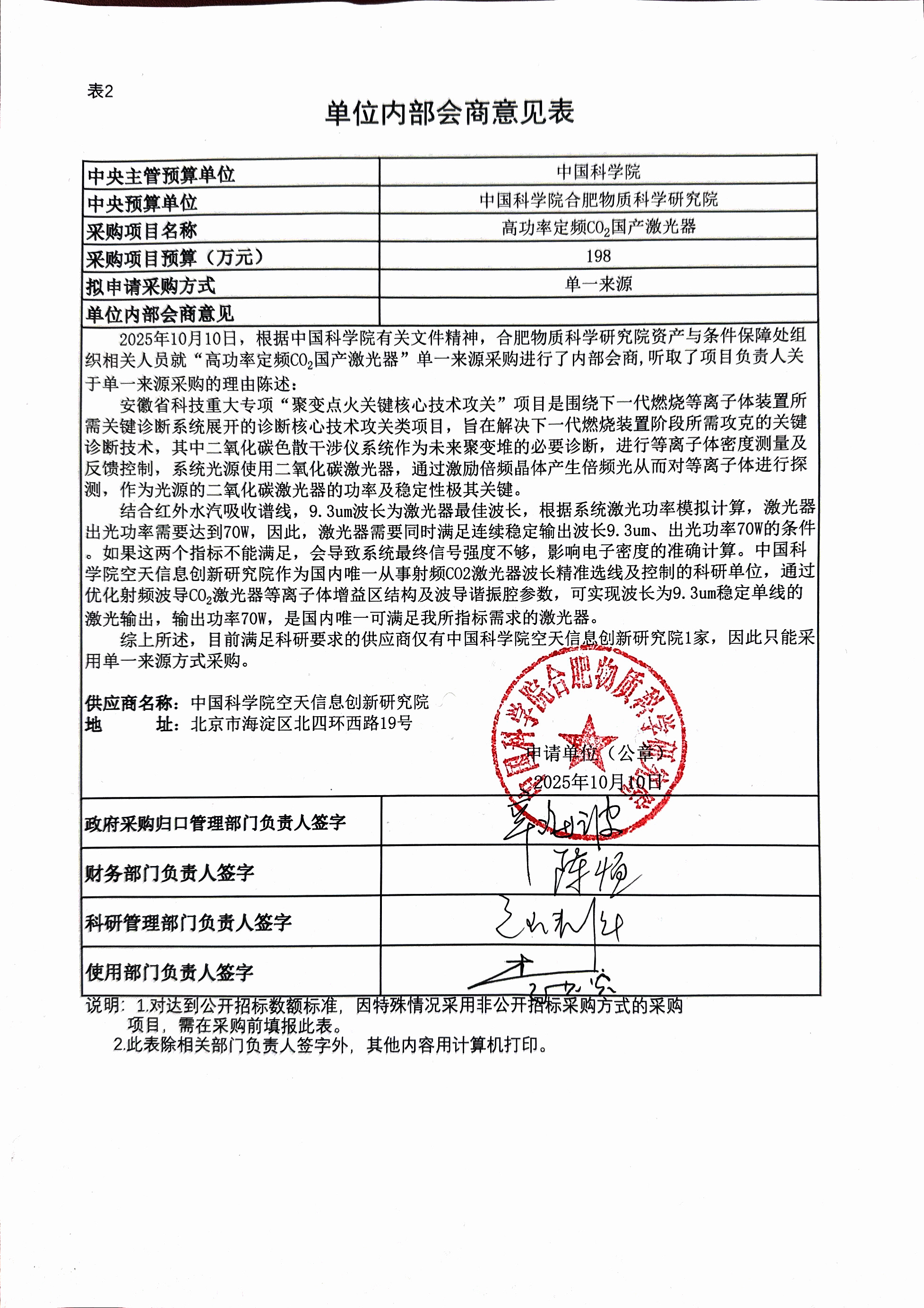 关于《高功率定频CO2激光器》采用单一来源采购方式的单位内部会商意见的公示(2025.11.18-2025.11.25)