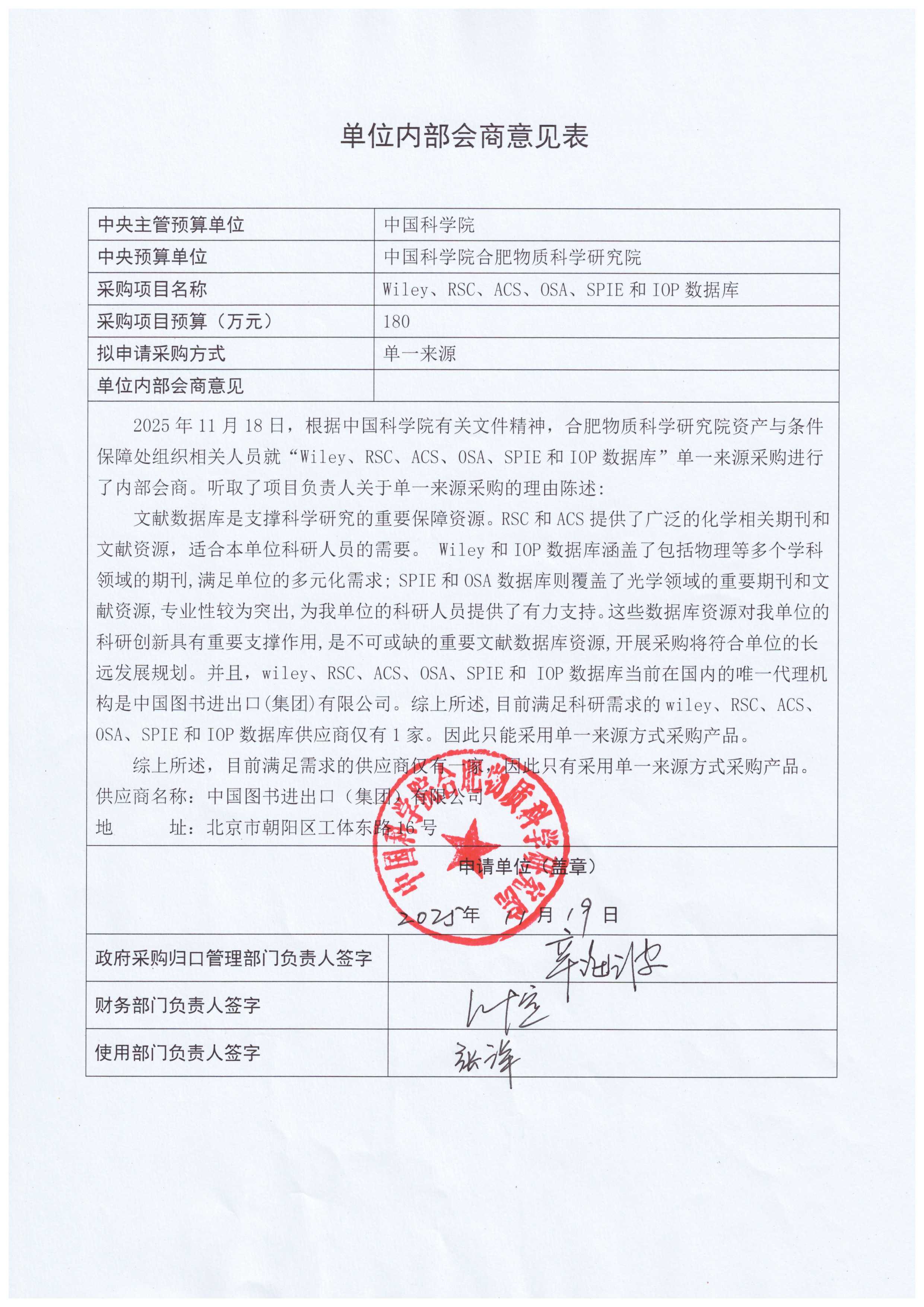 关于《Wiley、RSC、ACS、OSA、SPIE和IOP数据库》采用单一来源采购方式的单位内部会商意见的公示(2025.11.20-2025.11.27)