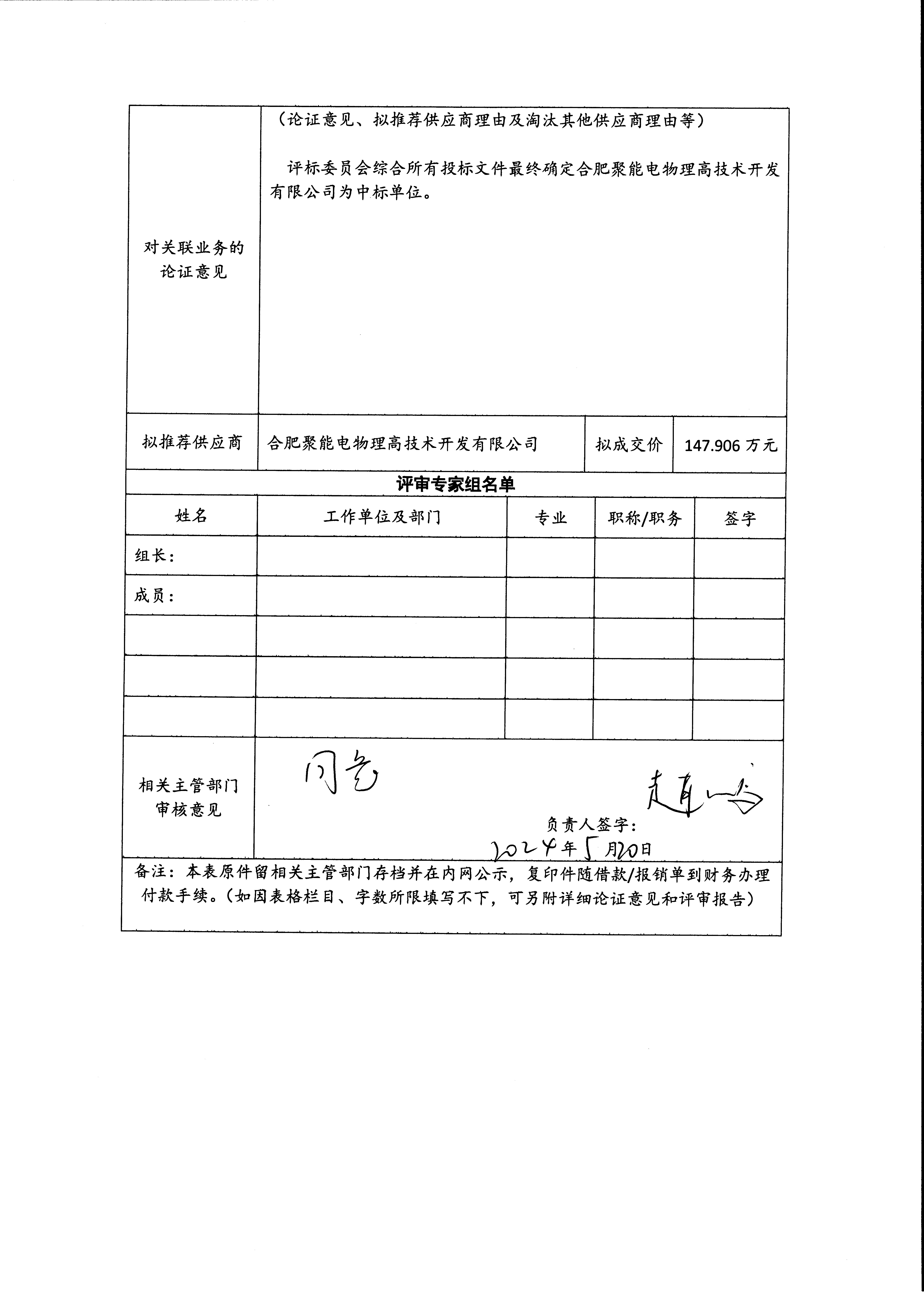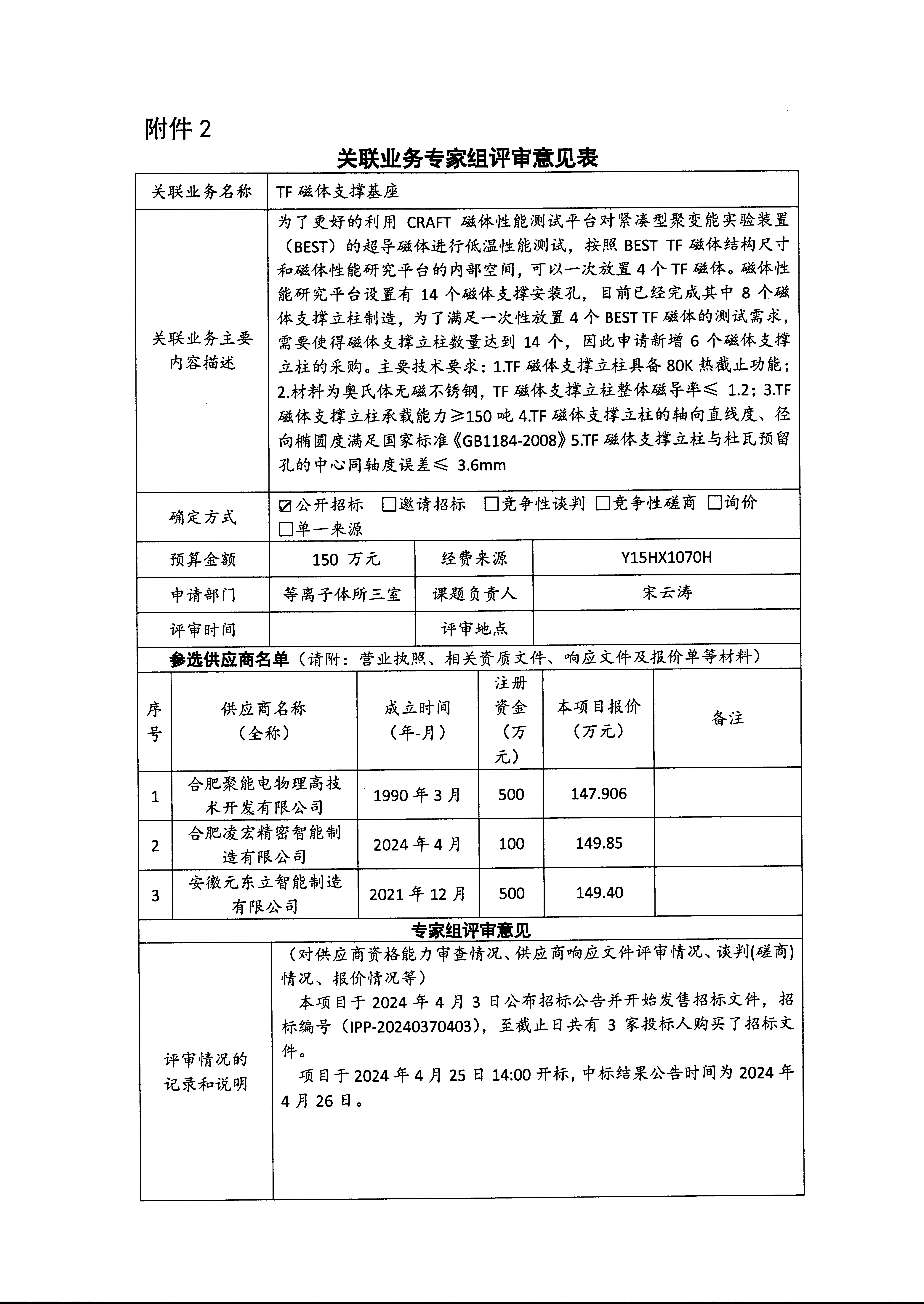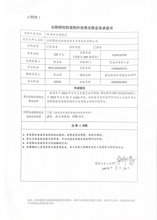 根据《中国科学院关于加强科研项目关联业务管理的暂行规定》(科发条财字〔2015〕125号)、《中国科学院合肥物质科学研究院关于加强科研项目关联业务管理的实施细则》(科合院发资字〔2021〕8号)、《合肥研究院加强关联业务管理暂行办法》(科合院发资字〔2022〕1号)要求,现就我院委托合肥聚能电物理高技术开发有限公司加工制造TF磁体支撑基座的关联业务进行公示。