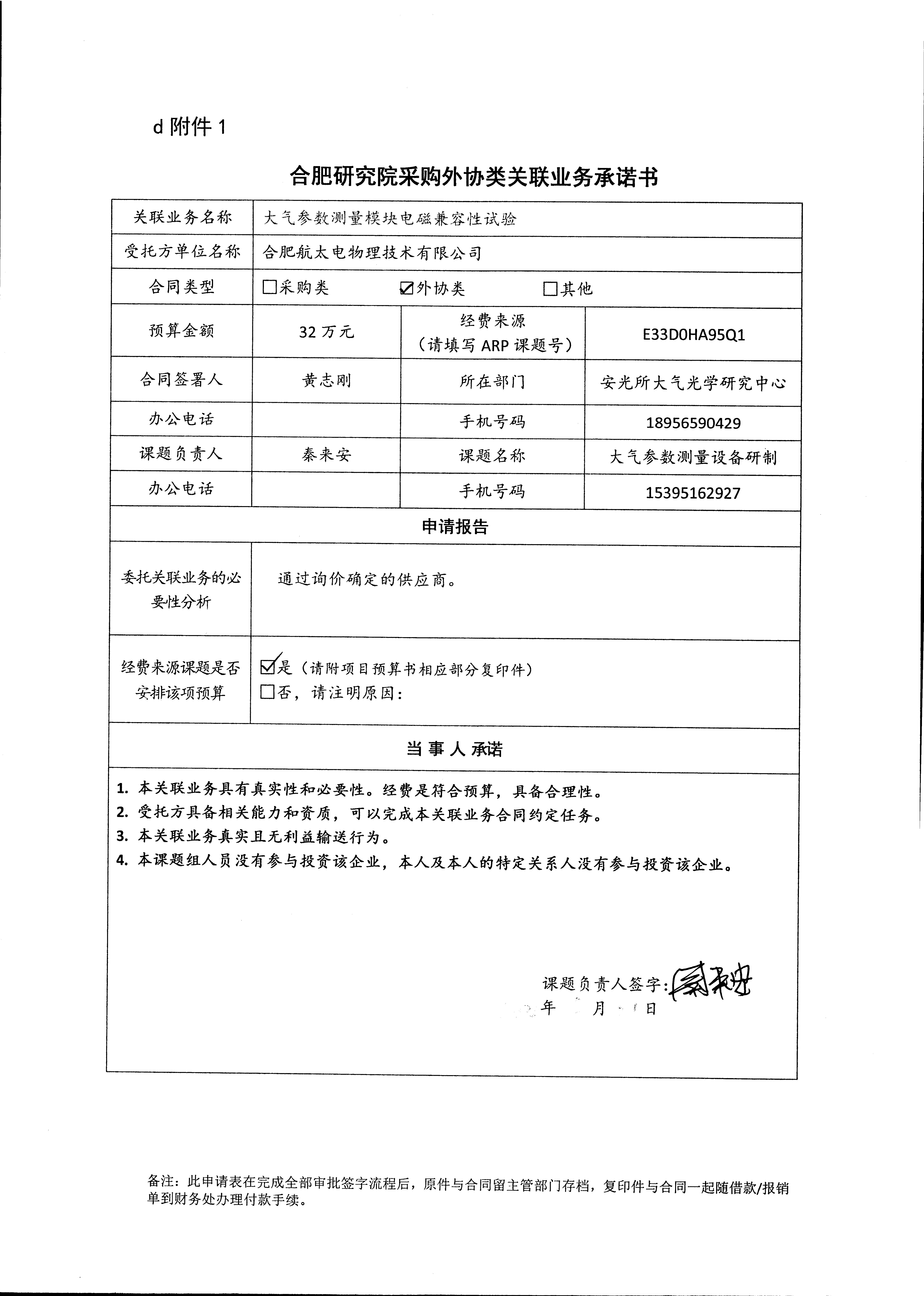 中国科学院合肥物质科学研究院光学精密机械研究所秦来安老师委托合肥航太电物理技术有限公司进行大气参数测量模块电磁兼容性试验服务。该服务主要是用于验证大气参数测量模块各个设备是否满足国军标151B标准。预期气溶胶消光雷达、大气相干长度仪、天光背景亮度仪、近地面大气参数单元等设备将完成CE102、CS101、CS114、CS115、CS116、RE102、RS103七项电磁兼容性试验。合肥航太电物理技术有限公司股东包含我单位职工段静波老师,持股比例为9.8009%,本次业务构成关联交易。