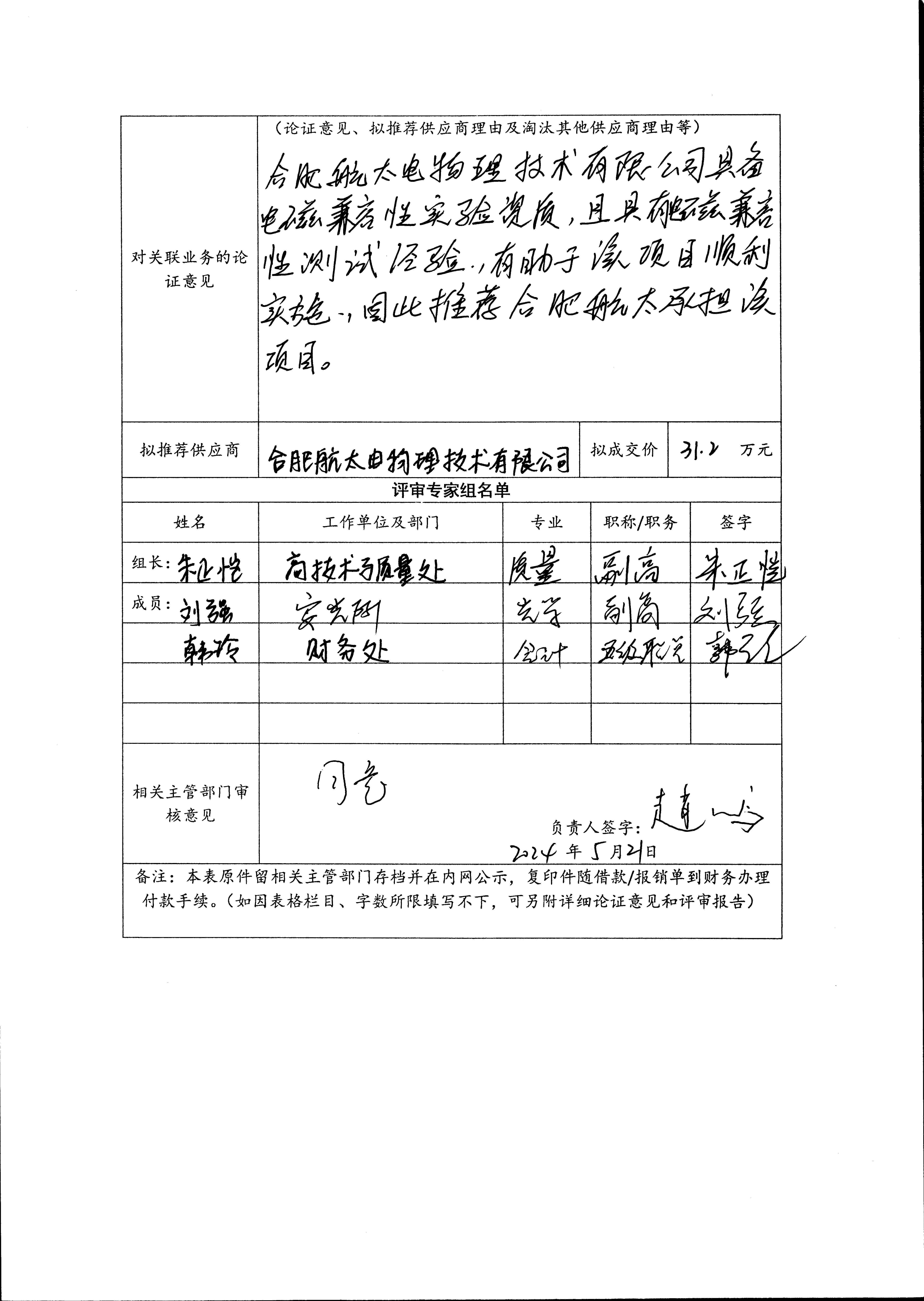 根据《中国科学院关于加强科研项目关联业务管理的暂行规定》(科发条财字〔2015〕125号)、《中国科学院合肥物质科学研究院关于加强科研项目关联业务管理的实施细则》(科合院发资字〔2021〕8号)、《合肥研究院加强关联业务管理暂行办法》(科合院发资字〔2022〕1号)要求,现就我院关于委托合肥航太电物理技术有限公司进行大气参数测量模块电磁兼容性试验服务的关联业务进行公示。