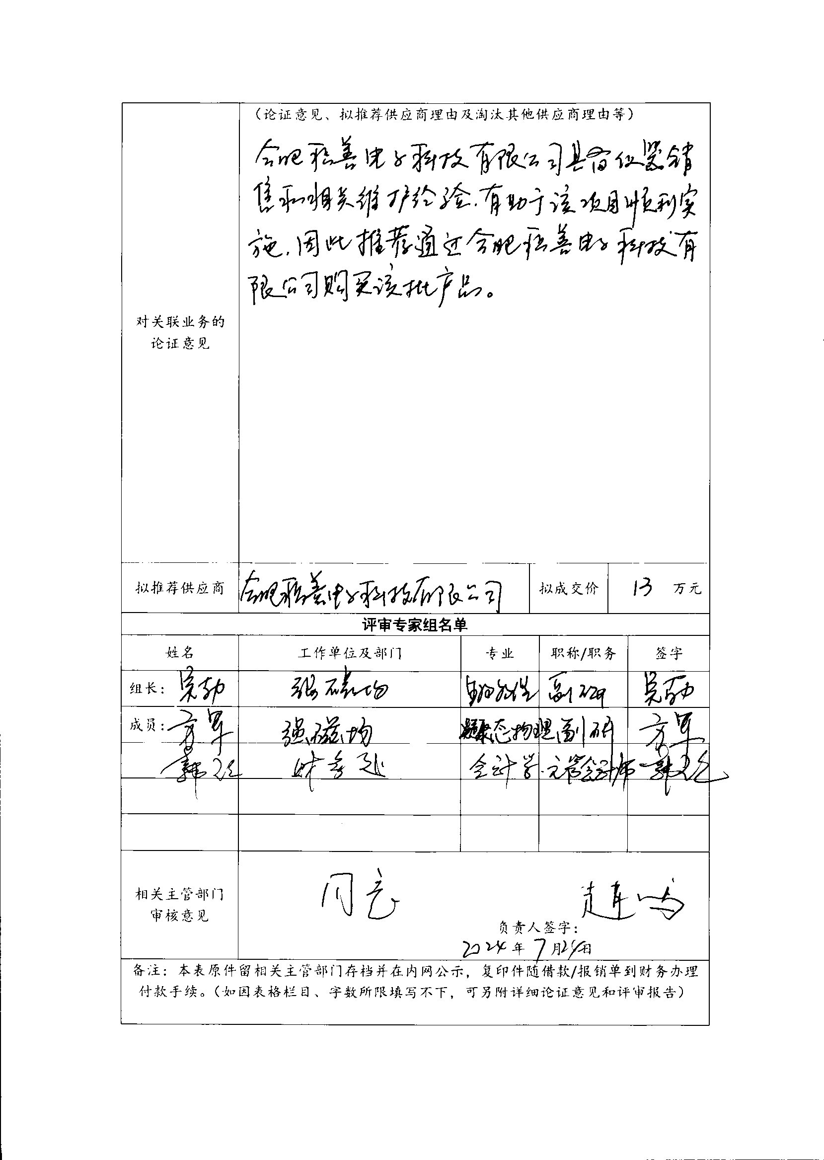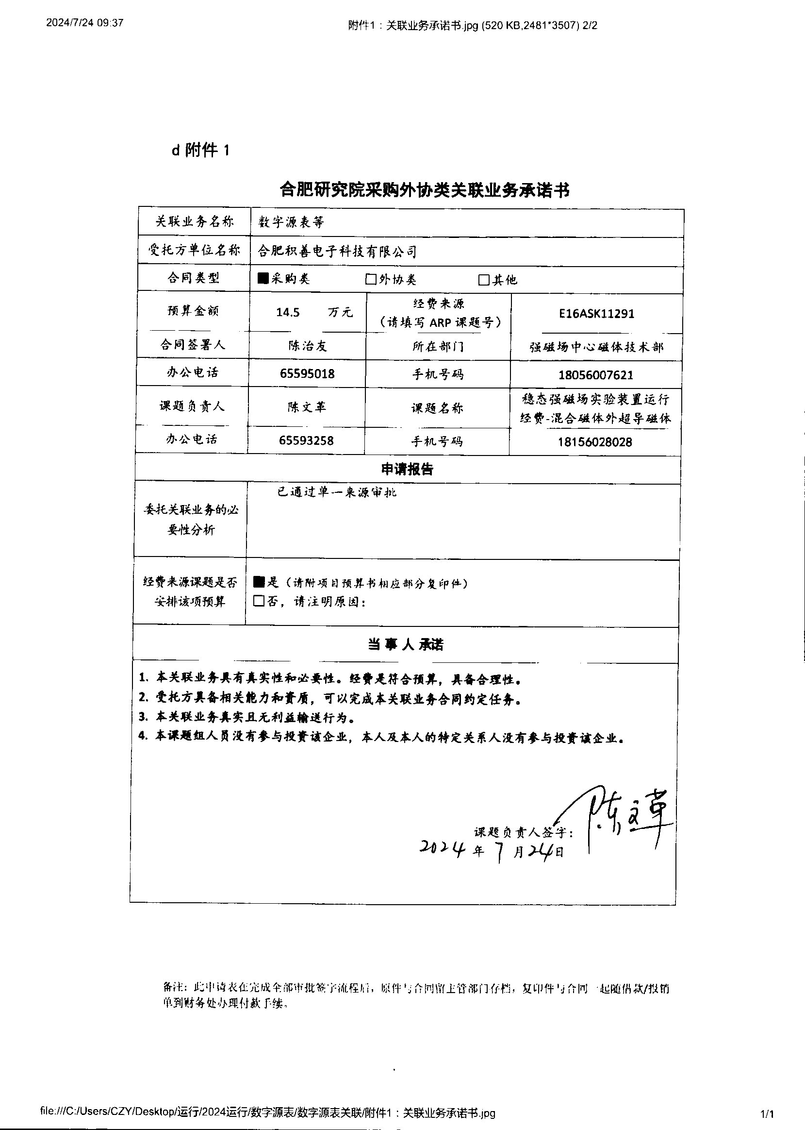 根据《中国科学院关于加强科研项目关联业务管理的暂行规定》(科发条财字〔2015〕125号)、《中国科学院合肥物质科学研究院关于加强科研项目关联业务管理的实施细则》(科合院发资字〔2021〕8号)、《合肥研究院加强关联业务管理暂行办法》(科合院发资字〔2022〕1号)要求,现就我院向合肥积善电子科技有限公司采购数字源表等的关联业务进行公示。