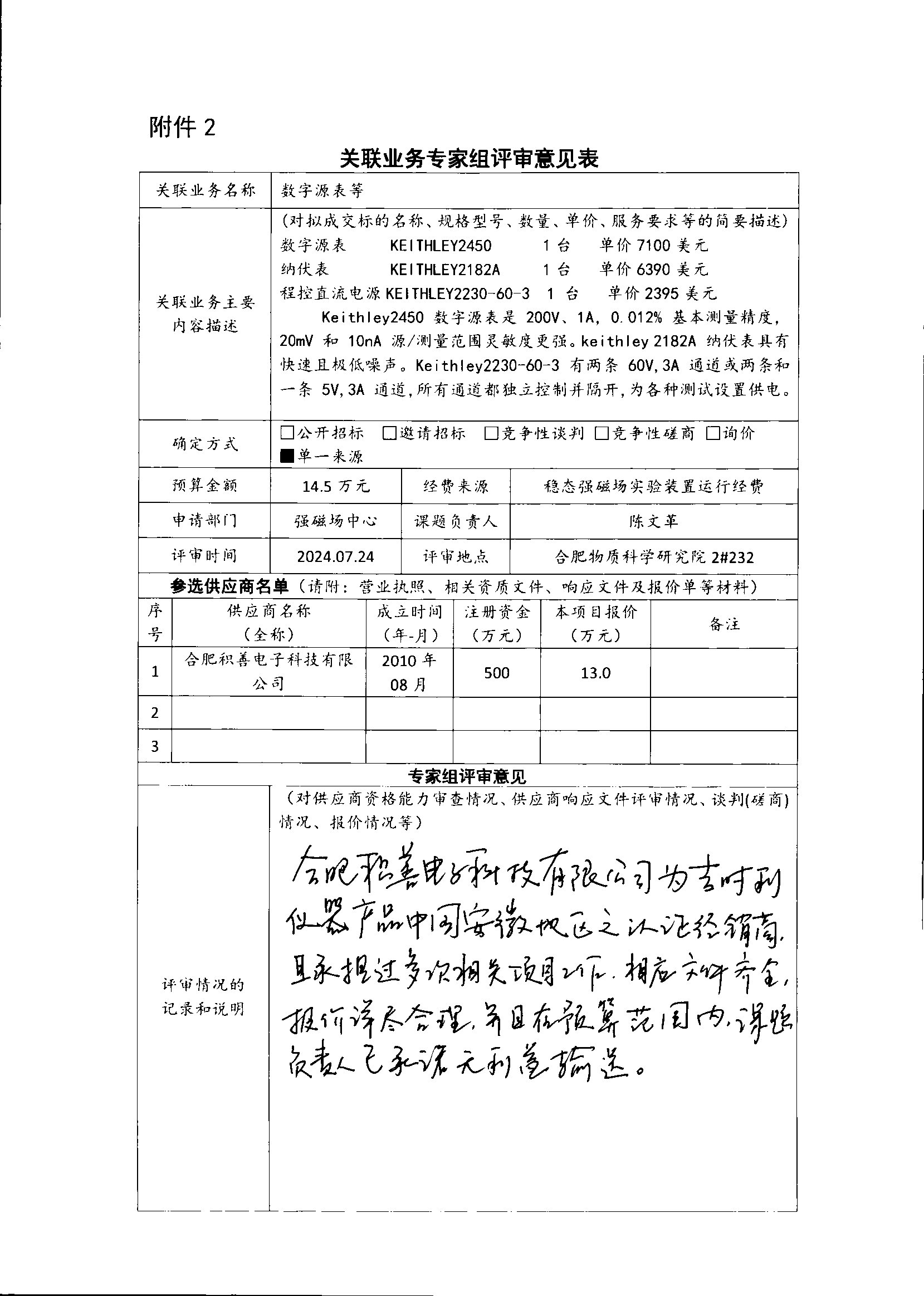 中国科学院合肥物质科学研究院强磁场科学中心陈文革老师向合肥积善电子科技有限公司购买数字源表等。Keithley2450 数字源表是 200V、1A,0.012% 基本测量精度, 20mV 和 10nA 源/测量范围灵敏度更强。keithley 2182A 纳伏表具有快速且极低噪声。Keithley2230-60-3 有两条 60V,3A 通道或两条和 一条 5V,3A 通道,所有通道都独立控制并隔开,为各种测试设置供电。合肥积善电子科技有限公司是合肥研究院职工的特定关系人参与投资的企业,本次业务构成关联交易。