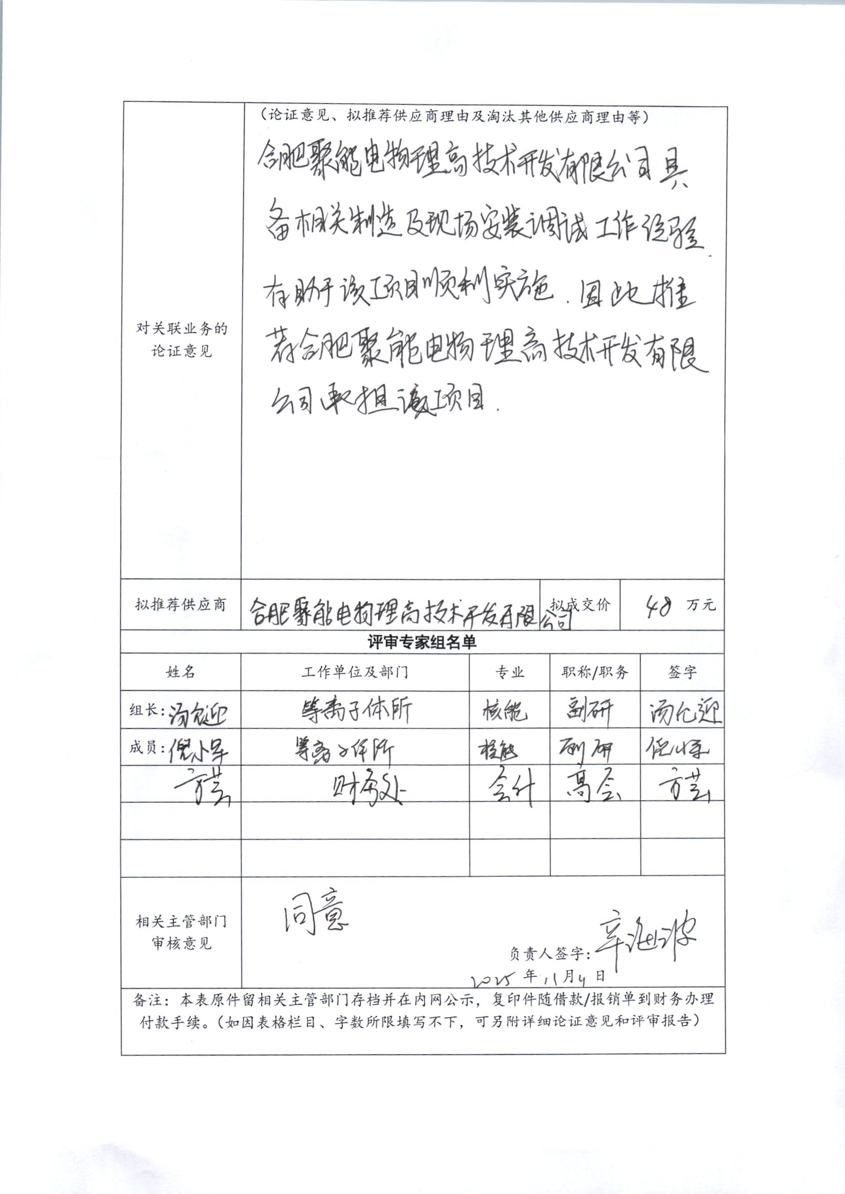 根据《中国科学院关于加强科研项目关联业务管理的暂行规定》(科发条财字〔2015〕125号)、《中国科学院合肥物质科学研究院关于加强科研项目关联业务管理的实施细则》(科合院发资字〔2021〕8号)、《合肥研究院加强关联业务管理暂行办法》(科合院发资字〔2022〕 1号)、《合肥物质院加强关联业务管理补充规定》(科合院发资字〔2025〕1号)要求,现就我院委托合肥聚能电物理高技术开发有限公司进行ECRH传输线支撑制造及现场安装的关联业务做公示。