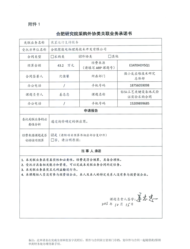 根据《中国科学院关于加强科研项目关联业务管理的暂行规定》(科发条财字〔2015〕125号)、《中国科学院合肥物质科学研究院关于加强科研项目关联业务管理的实施细则》(科合院发资字〔2021〕8号)、《合肥研究院加强关联业务管理暂行办法》(科合院发资字〔2022〕 1号)、《合肥物质院加强关联业务管理补充规定》(科合院发资字〔2025〕1号)要求,现就我院委托合肥聚能电物理高技术开发有限公司进行装置运行支持服务的关联业务做公示。