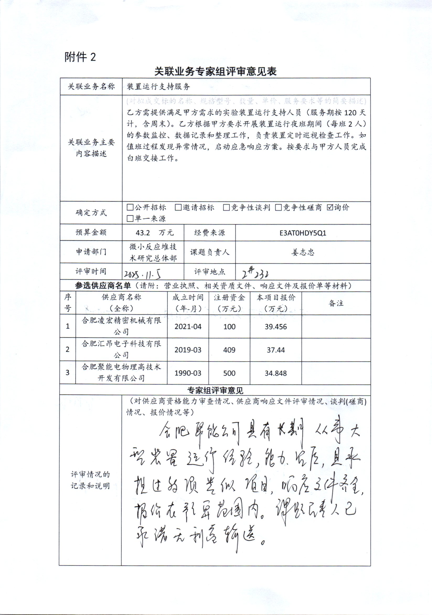 中国科学院合肥物质科学研究院核能安全技术研究所姜志忠老师委托合肥聚能电物理高技术开发有限公司进行装置运行支持服务。要求开展装置运行夜班期间的参数监控、数据记录和整理工作,负责装置定时巡视检查工作运行支持。合肥聚能电物理高技术开发有限公司股东之一为合肥科学岛控股有限公司,该公司在其中占股35%,本次构成关联业务交易。