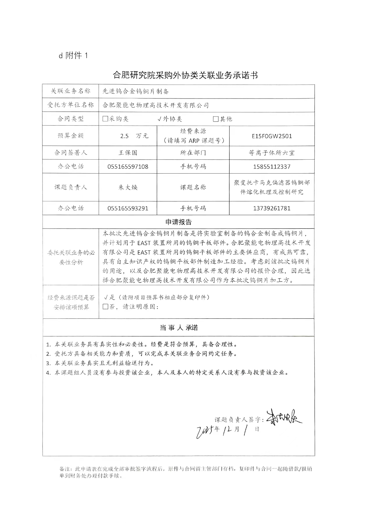 中国科学院合肥物质科学研究院等离子体物理研究所朱大焕老师委托合肥聚能电物理高技术开发有限公司进行先进钨合金钨铜片制备。需要利用其拥有的EAST钨铜平板部件加工技术,将实验室所制备的非标钨合金材料制造成可用于EAST钨铜平板部件的钨铜片。本次采购旨在研究改善乃至解决目前EAST偏滤器钨铜平板部件所存在的损伤问题。合肥聚能电物理高技术开发有限公司股东之一为合肥科学岛控股有限公司,该公司在其中占股35%,本次构成关联业务交易。