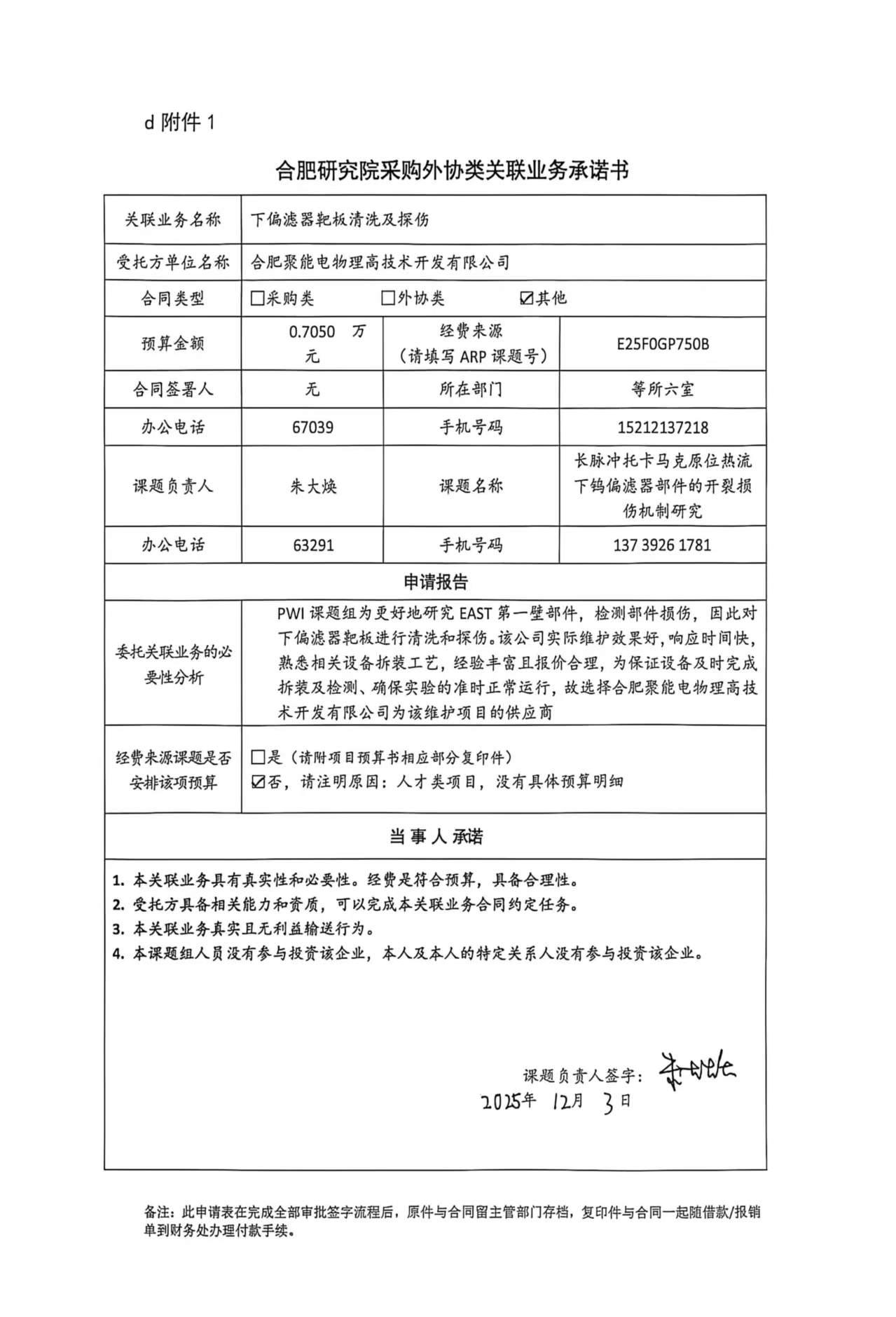 根据《中国科学院关于加强科研项目关联业务管理的暂行规定》(科发条财字〔2015〕125号)、《中国科学院合肥物质科学研究院关于加强科研项目关联业务管理的实施细则》(科合院发资字〔2021〕8号)、《合肥研究院加强关联业务管理暂行办法》(科合院发资字〔2022〕 1号)、《合肥物质院加强关联业务管理补充规定》(科合院发资字〔2025〕1号)要求,现就我院委托合肥聚能电物理高技术开发有限公司进行下偏滤器靶板清洗及探伤的关联业务做公示。